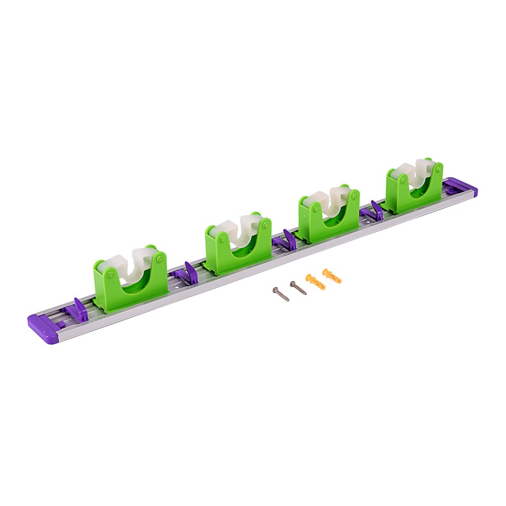 - Универсальность — на держателе предусмотрено 4 крюка для хозяйственных мелочей и 4 зажима для инструментов с черенком диаметром 20-35 мм.
