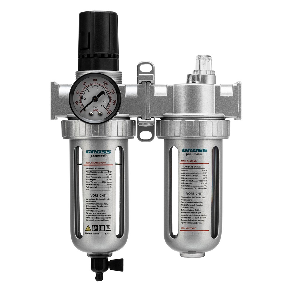 Блок подготовки воздуха Gross G804 57451 с присоединительной резьбой 1/2 дюйма одновременно выполняет функции регулятора уровня давления, фильтра и лубрикатора. Устройство используется с компрессорами, работающими под давлением до 10 бар, и будет полезно на производстве, строительной площадке и в автомастерской.