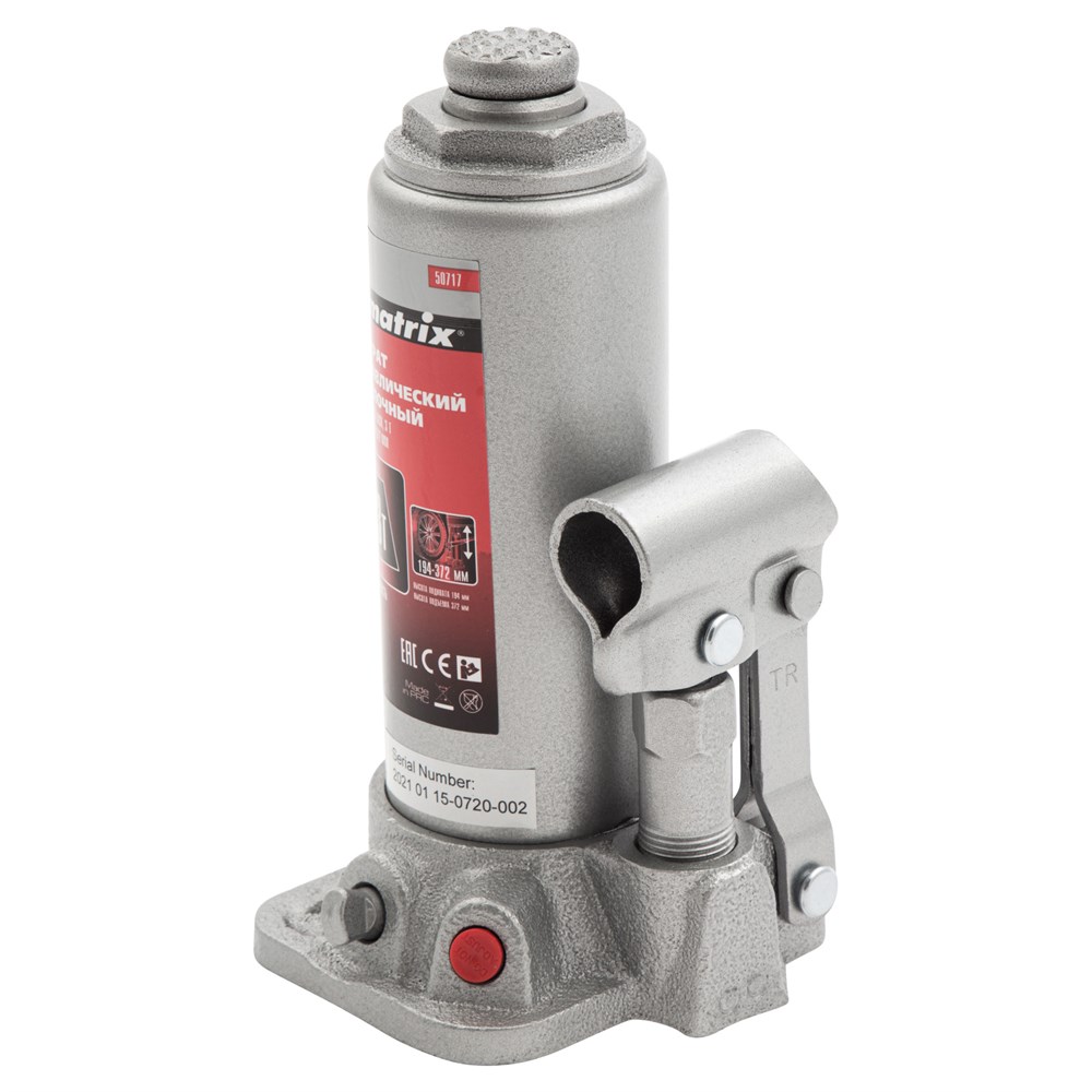 НаименованиеДомкрат гидравлический бутылочный, 3 т, высота подъема 194-372 мм Matrix