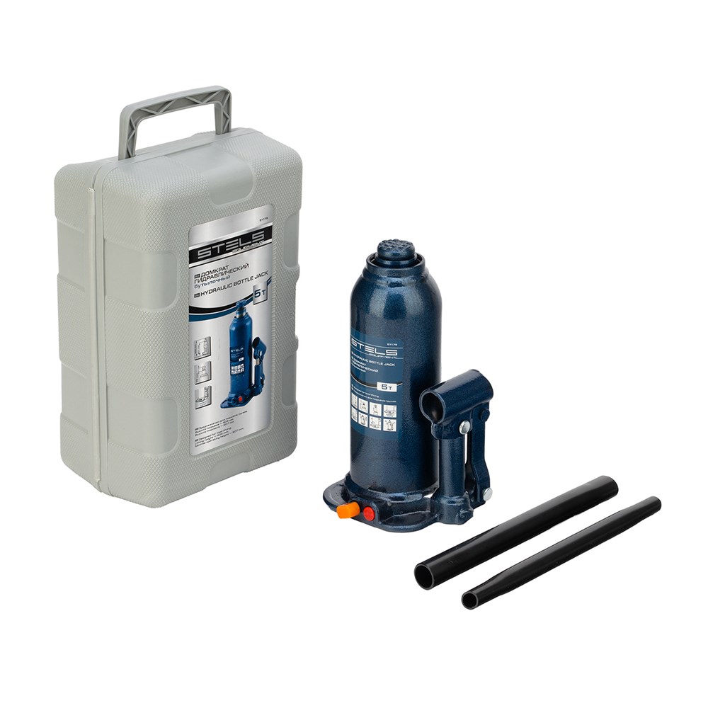Гидравлический бутылочный домкрат Stels 51175 в пластиковом кейсе предназначен для поднятия грузов весом до 5 т на высоту 207-404 мм. Он не занимает много места и легко помещается в багажник, поэтому его можно брать с собой в дорогу или хранить в гараже. Используется для самостоятельного ремонта авто, также подходит для профессионального применения на станциях технического обслуживания.