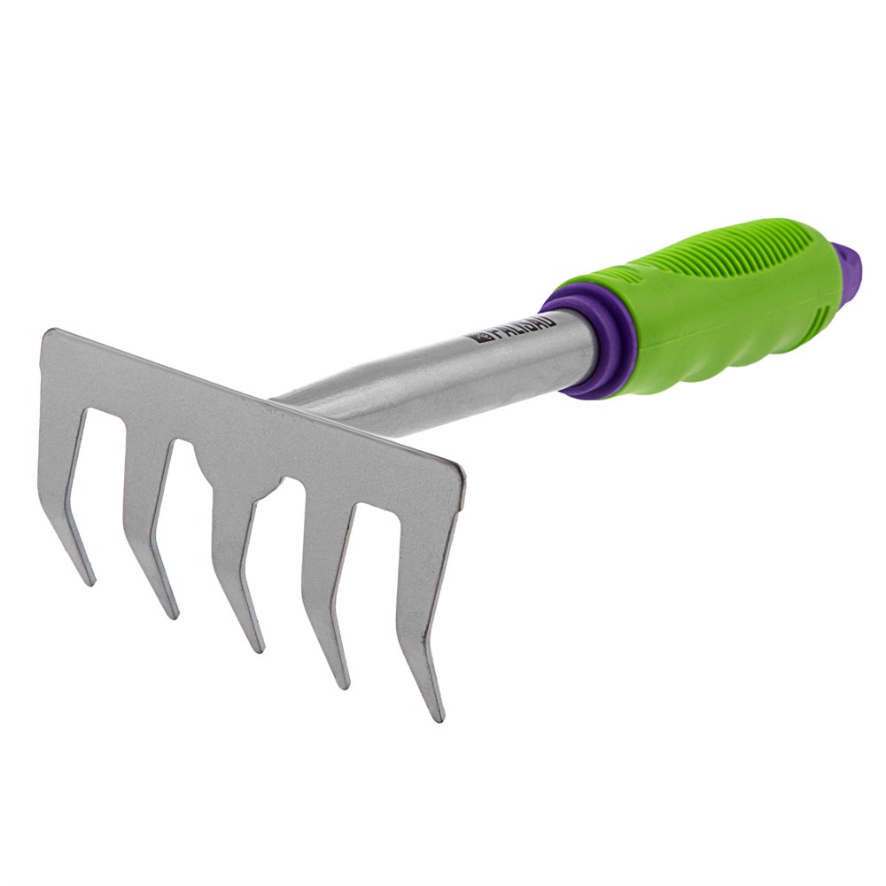 Стальные 5-зубые грабли Palisad CONNECT 63003 размером 115 х 275 мм, с пластиковой рукояткой, используются для удаления мелкого мусора и срезанных стеблей, а также для рыхления почвы на небольших участках — клумбах, грядках. Инструмент пригодится во время работы в цветнике или огороде. Грабли совместимы с удлиняющими штангами на 500 мм и на 800 мм — Palisad 63016 и 63017.
