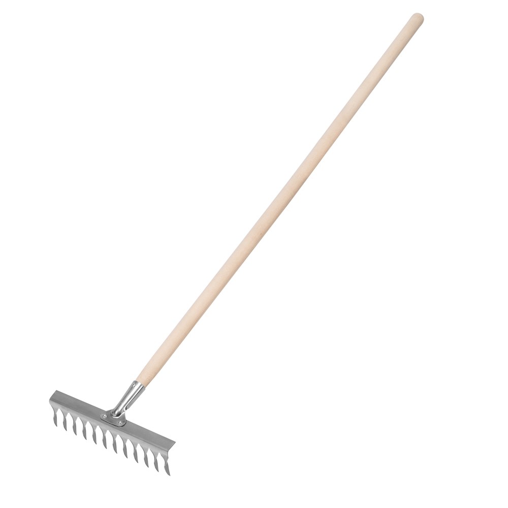 Грабли из нержавеющей стали Сибртех 61754 длиной 1300 мм, с гребенкой шириной 290 мм, с 12 витыми зубьями, служат для рыхления и выравнивания почвы и незаменимы для ухода за дачным участком. Грабли установлены на деревянный черенок и полностью готовы к использованию.