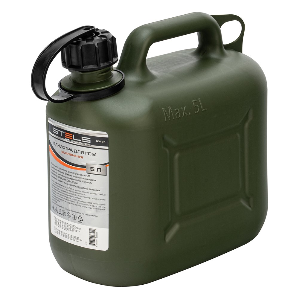 Усиленная пластиковая канистра Stels 53124 объемом 5 л, вертикальная, используется для транспортировки топлива и других ГСМ, а также их хранения в гараже или на даче. Будет полезна для дозаправки автомобиля в дороге. Также пригодится для обслуживания бензотехники: пил, триммеров, газонокосилок и другого оборудования.