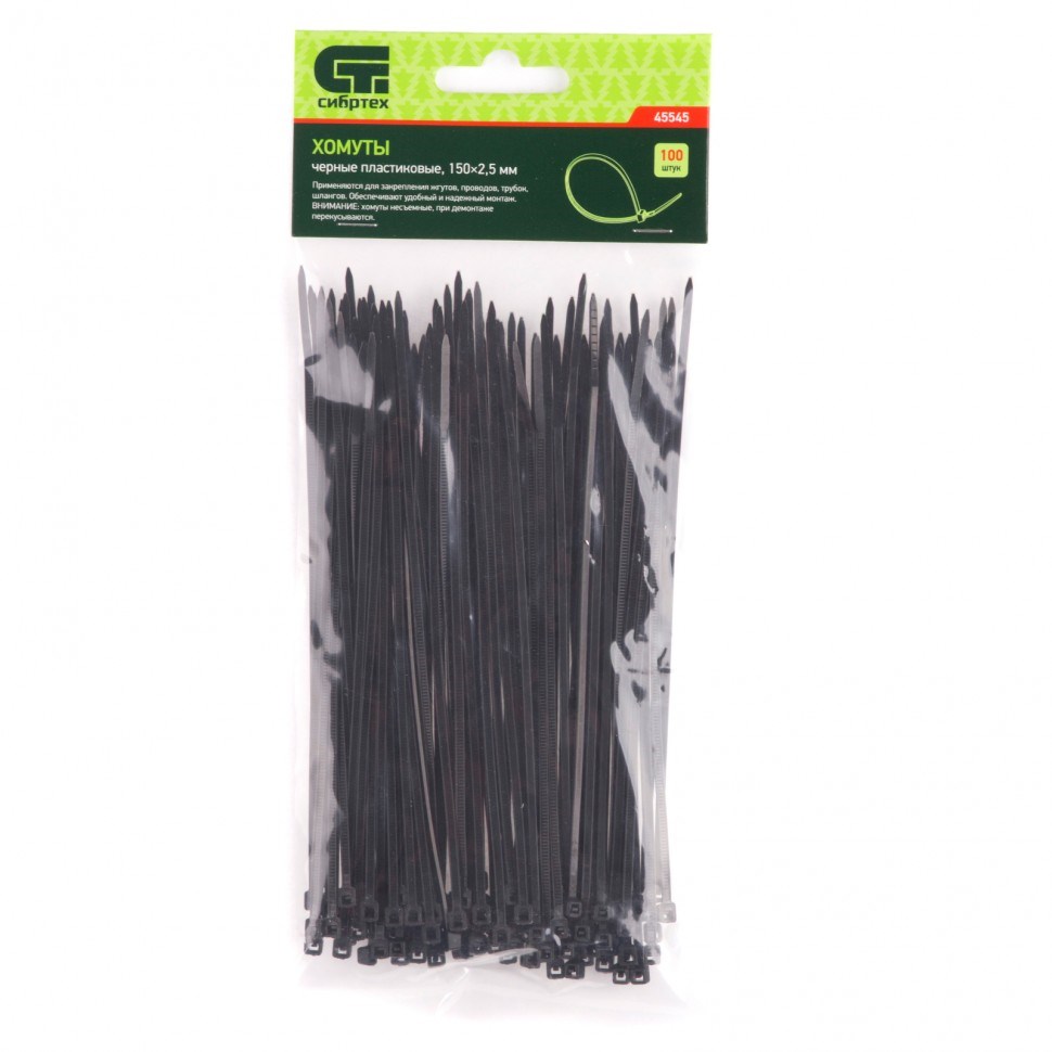 Черные пластиковые хомуты Сибртех 45545, 150 х 2,5 мм, 100 шт. в упаковке, используются для стяжки кабелей, закрепления трубок, шлангов, рекламных конструкций, а также для упаковки различных предметов. Пригодятся во время прокладки электрических и локальных вычислительных сетей, ремонта компьютерной техники, оформлении торговых стендов, комплектовании товара, будут также полезны дома, на даче и в гараже.