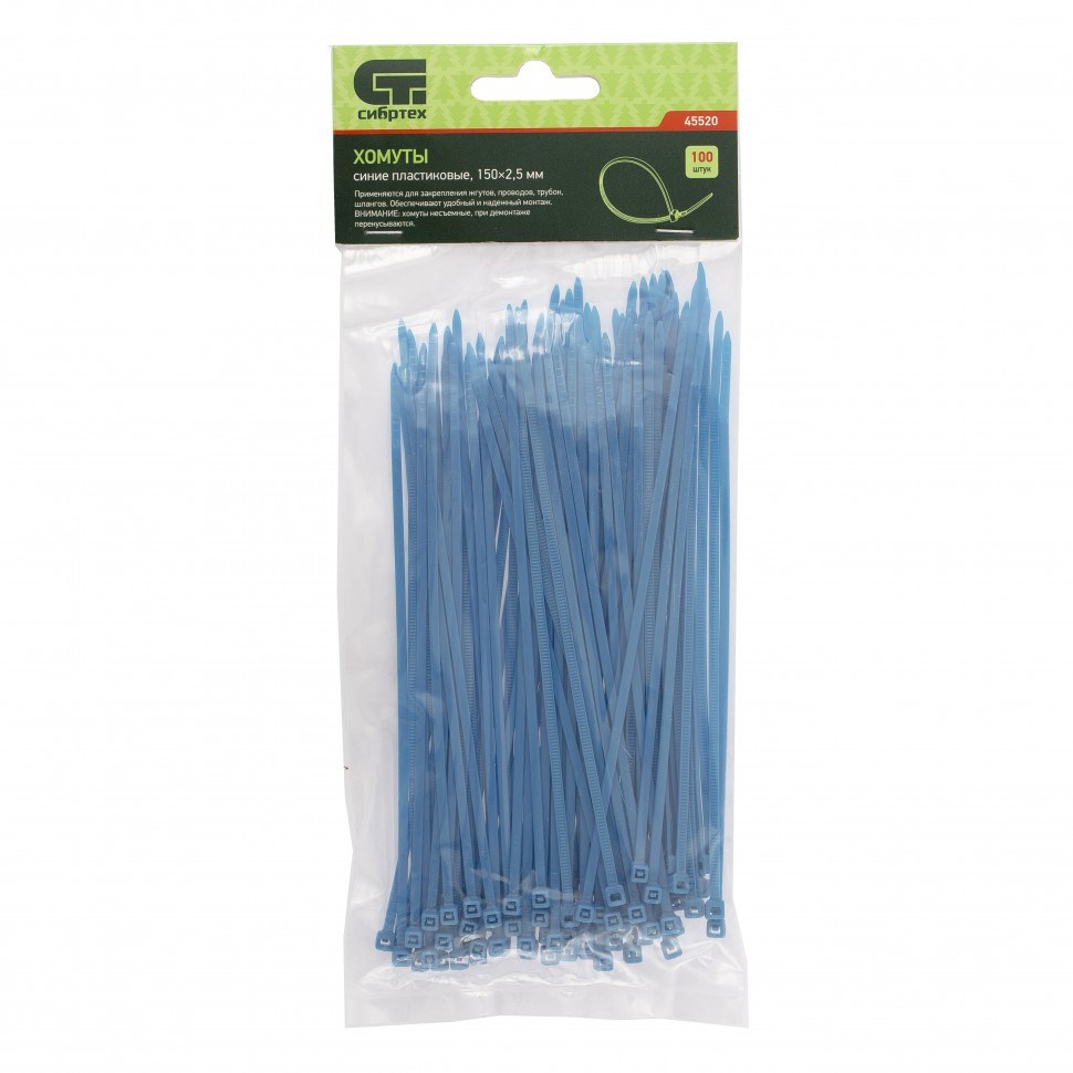 Синие пластиковые хомуты Сибртех 45520, 150 х 2,5 мм, 100 шт. в упаковке, используются для стяжки кабелей, закрепления трубок, шлангов, рекламных конструкций, а также для упаковки различных предметов. Пригодятся во время прокладки электрических и локальных вычислительных сетей, ремонта компьютерной техники, оформлении торговых стендов, комплектовании товара, будут также полезны дома, на даче и в гараже.