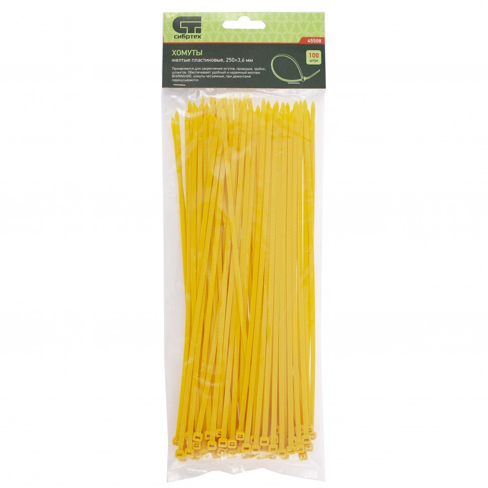 Желтые пластиковые хомуты Сибртех 45508, 250 х 3,6 мм, 100 шт. в упаковке, используются для стяжки кабелей, закрепления трубок, шлангов, рекламных конструкций, а также для упаковки различных предметов. Пригодятся во время прокладки электрических и локальных вычислительных сетей, ремонта компьютерной техники, оформлении торговых стендов, комплектовании товара, будут также полезны дома, на даче и в гараже.