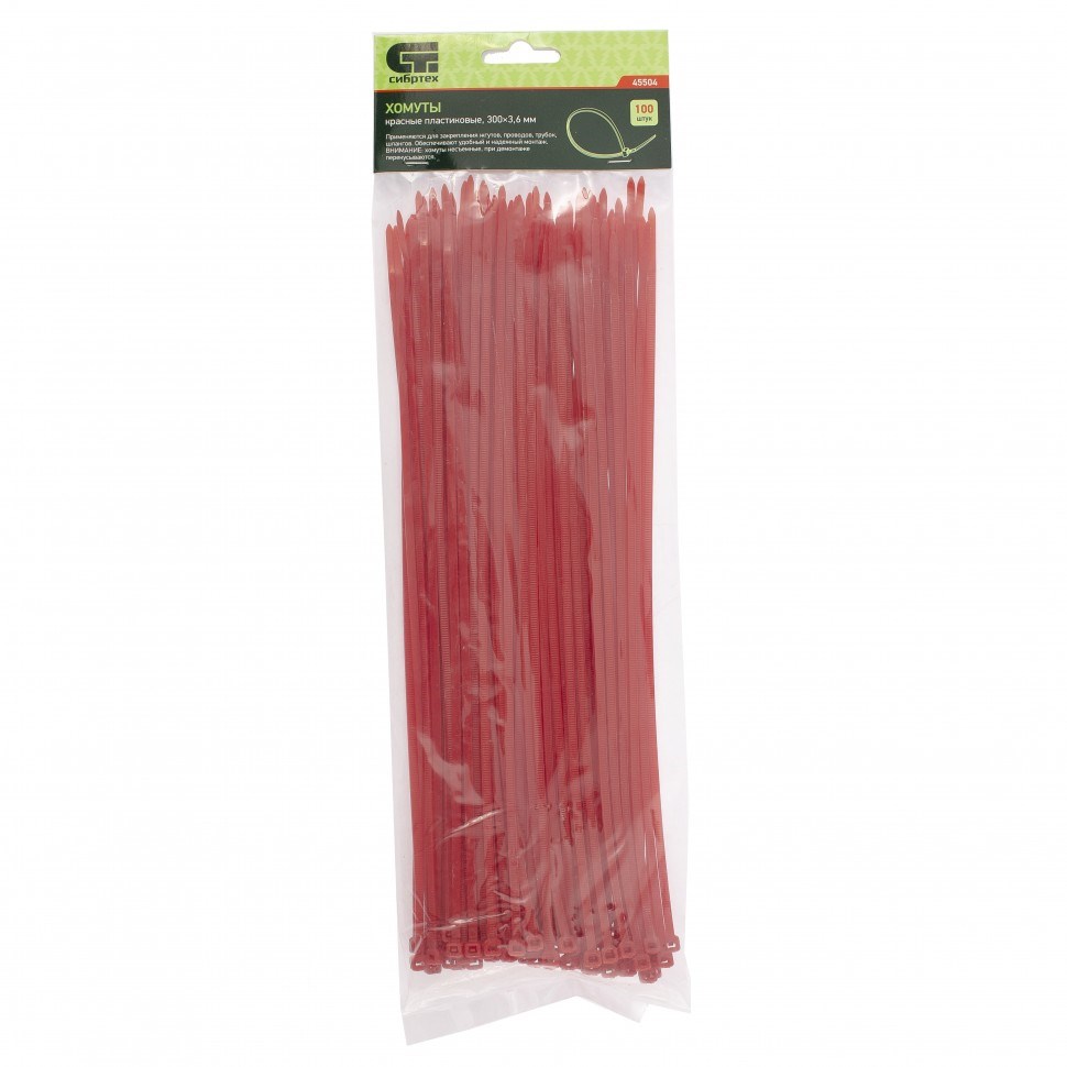 Красные пластиковые хомуты Сибртех 45504, 300 х 3,6 мм, 100 шт. в упаковке, используются для стяжки кабелей, закрепления трубок, шлангов, рекламных конструкций, а также для упаковки различных предметов. Пригодятся во время прокладки электрических и локальных вычислительных сетей, ремонта компьютерной техники, оформлении торговых стендов, комплектовании товара, будут также полезны дома, на даче и в гараже.