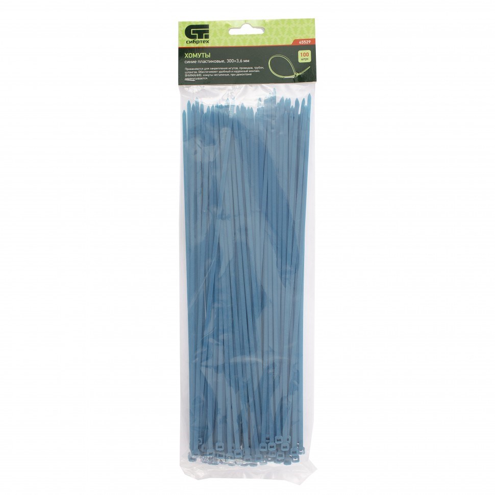 Синие пластиковые хомуты Сибртех 45529, 300 х 3,6 мм, 100 шт. в упаковке, используются для стяжки кабелей, закрепления трубок, шлангов, рекламных конструкций, а также для упаковки различных предметов. Пригодятся во время прокладки электрических и локальных вычислительных сетей, ремонта компьютерной техники, оформлении торговых стендов, комплектовании товара, будут также полезны дома, на даче и в гараже.