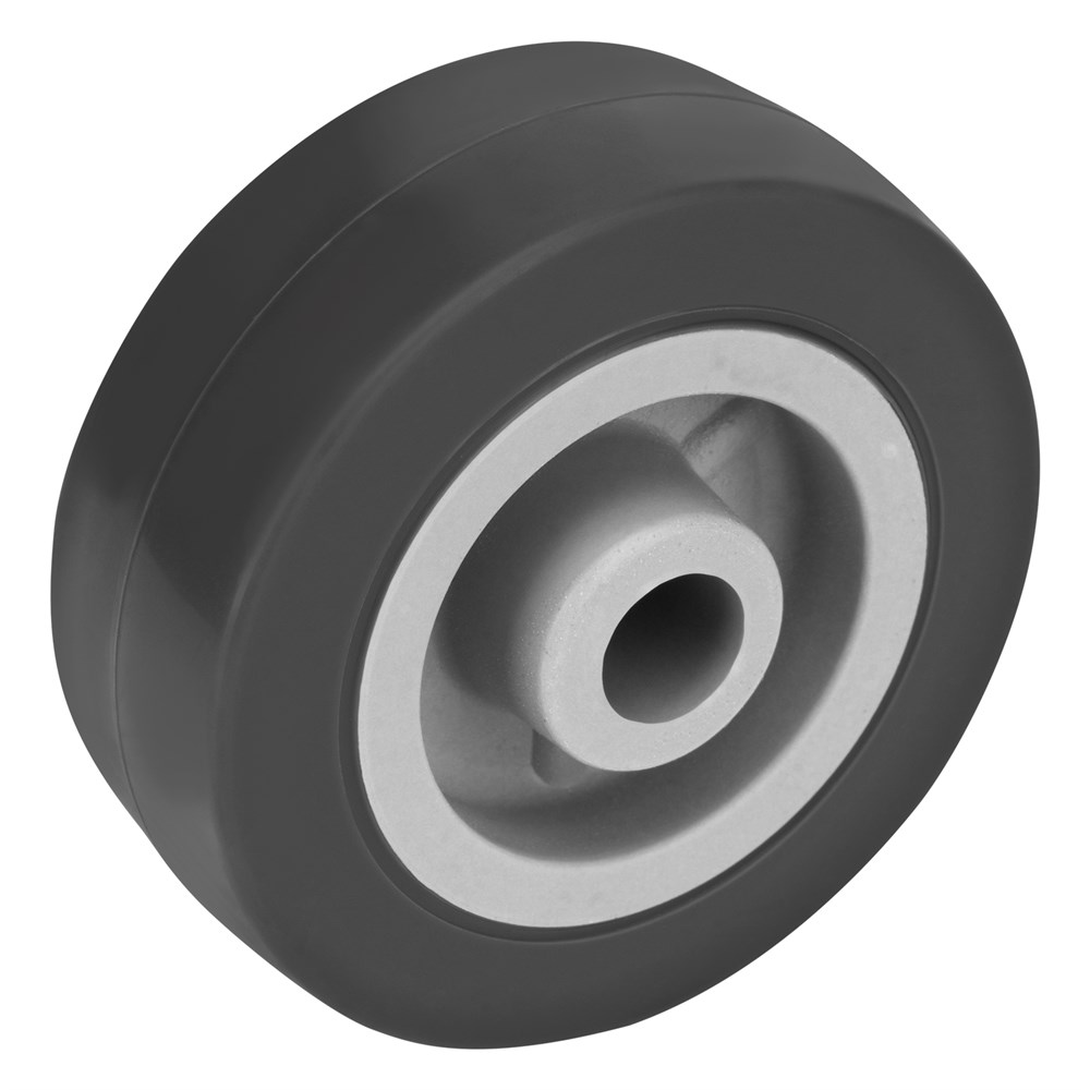 - Универсальность — контактная поверхность выполнена из термопластичной серой резины, поэтому колесо может применяться на различных покрытиях, долгое время сохраняя рабочие качества.