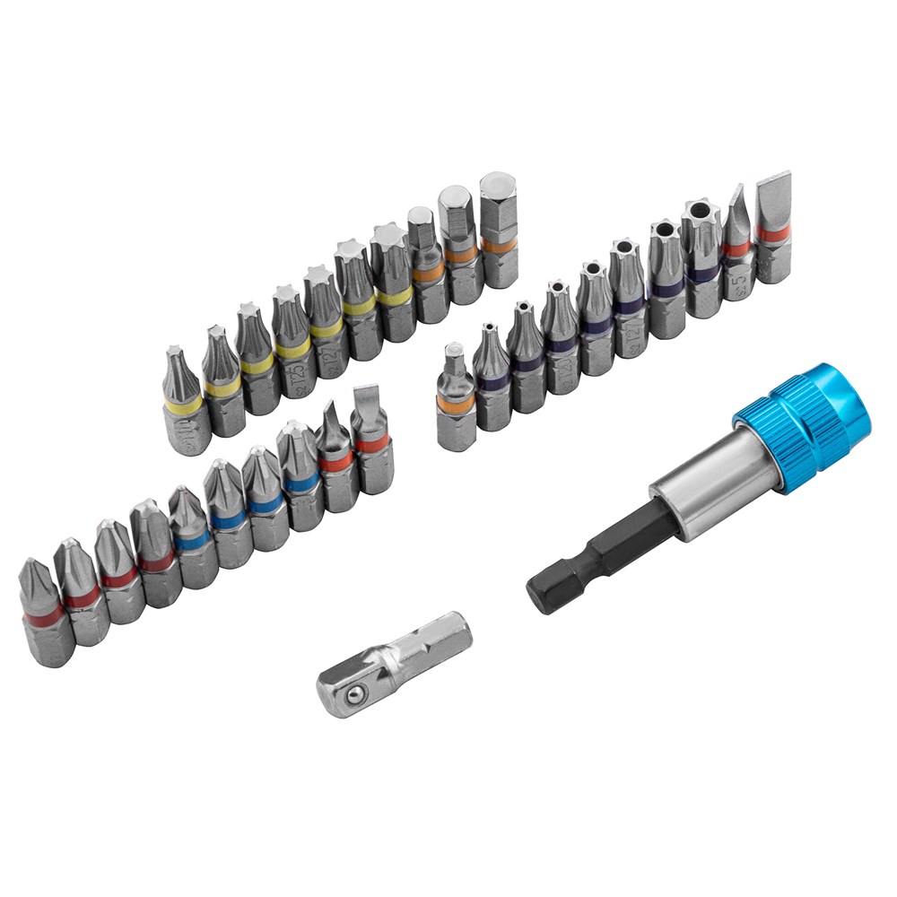 - Широкая комплектация — в одном наборе представлено 6 типов бит: PH и PZ калибров 1-3, SL калибров 3, 4, 5, 6, TORX и TORX Tamper (10, 15, 20, 25, 27, 30, 40), HEX 3-6