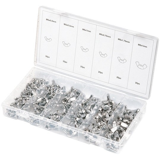 Набор гаек с «барашком» Сибртех 47606 состоит из 150 предметов и включает в себя гайки М5 х 0,5 мм — 30 шт., М5 х 0,8 мм — 30 шт., М6 х 1 мм — 25 шт., М6 х 0,75 мм — 25 шт., М8 х 1,75 мм — 20 шт. и М8 х 1 мм — 20 шт. Барашковые гайки имеют «ушки», позволяющие затягивать или ослаблять крепеж без применения инструментов. Они используются при сборке мебели, производстве оборудования и техники.