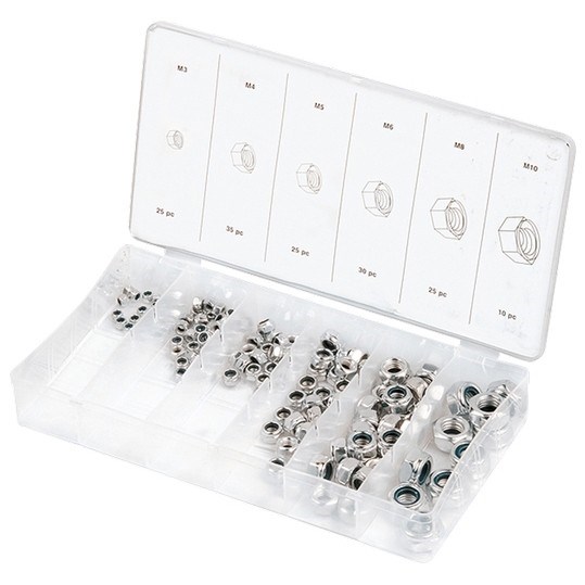 Набор Сибртех 47610 состоит из 150 предметов и включает самоконтрящиеся гайки М3 х 0,5 мм, М4 х 0,7 мм, М5 х 0,8 мм, М6 х 1 мм, М8 х 1,2 мм, М10 х 1,5 мм. Они предназначены для затягивания резьбовых соединений и используются для сборки различных механизмов — станков, автомобилей, бытовой техники и электроники.