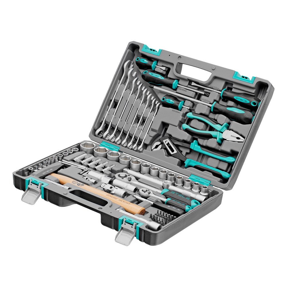 Набор инструментов Stels 14104 в ударопрочным пластиковом кейсе состоит из 76 предметов с присоединительными квадратами 1/2″ и 1/4″, из стали CrV и S2, и предназначен для выполнения слесарно-монтажных работ. Включает инструменты и насадки для работы с резьбовыми крепежами, а также удлинители и т-образный вороток, облегчающие работу в труднодоступных местах. Молоток, плоскогубцы и переставные клещи расширяют возможности применения набора. Набор предназначен для профессионального использования в автомастерской, будет полезен и для решения бытовых задач.