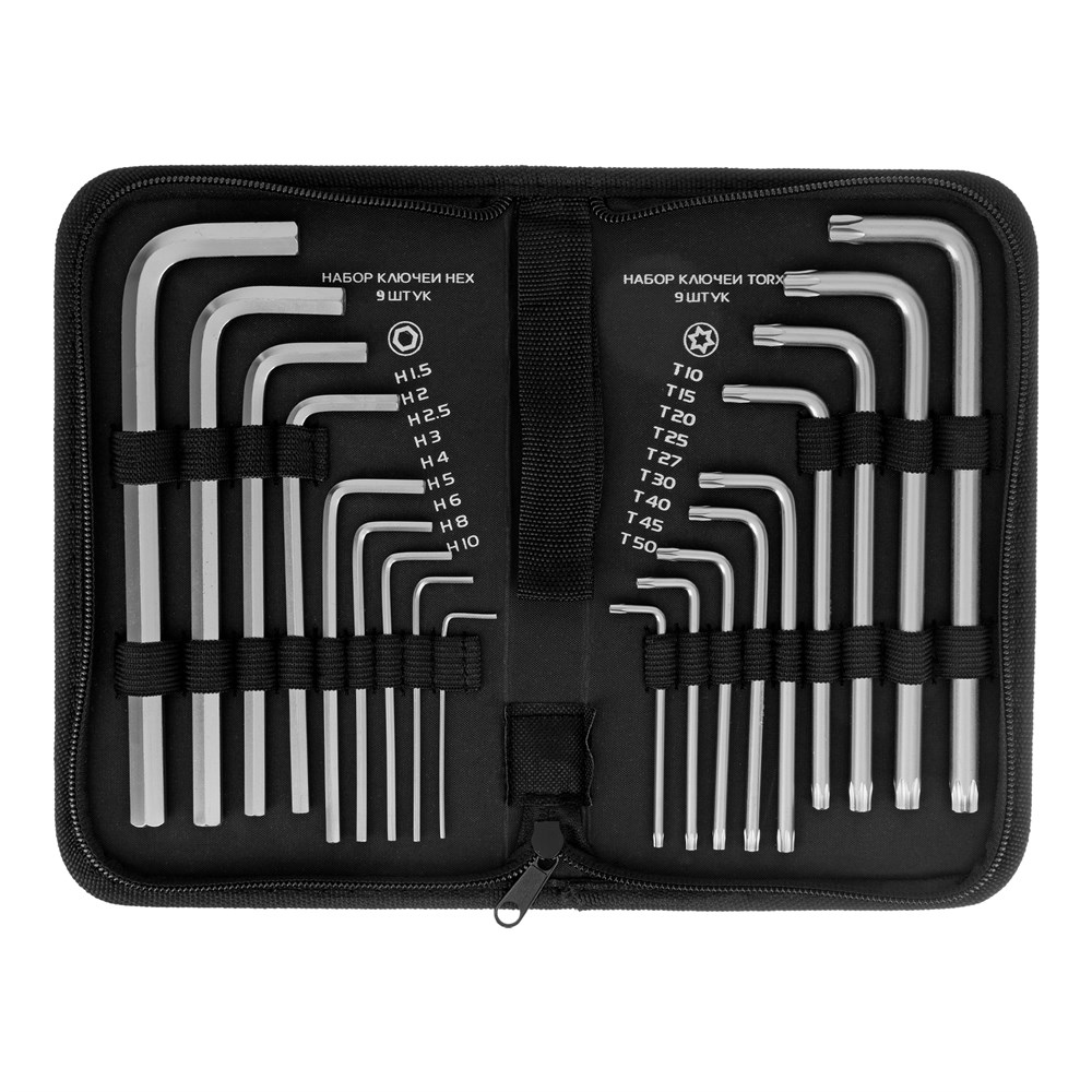 КомплектацияНейлоновый чехол - 1 штКлючи имбусовые HEX: 1.5 мм, 2 мм, 2.5 мм, 3 мм, 4 мм, 5 мм, 6 мм, 8 мм, 10 мм - 9 штКлючи имбусовые ТORX Tampered: TТ10, TT15, TT20, TT25, TT27, TT30, TT40, TT45, TT50 - 9 шт