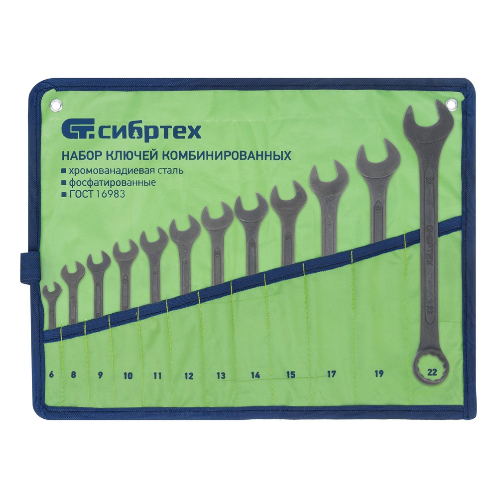НаименованиеНабор ключей комбинированных, 6 - 22 мм, 12 шт., CrV, фосфатированные Сибртех