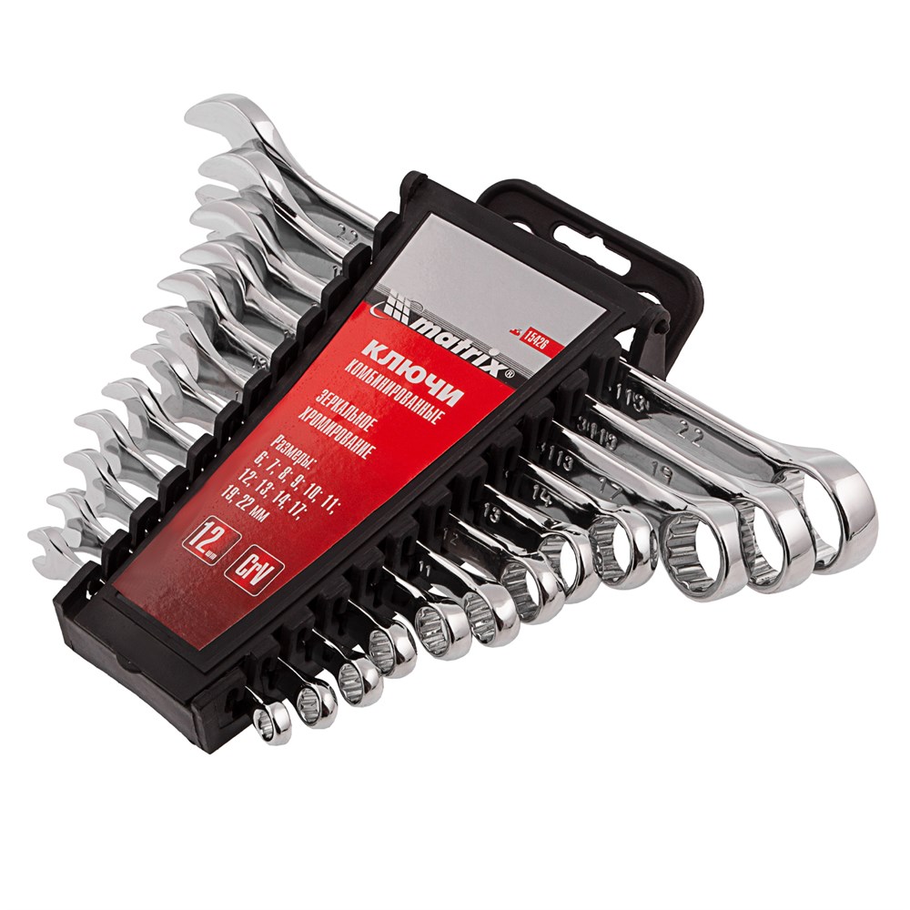 НаименованиеНабор ключей комбинированных, 6-22 мм, 12 шт, CrV, полированный хром Matrix