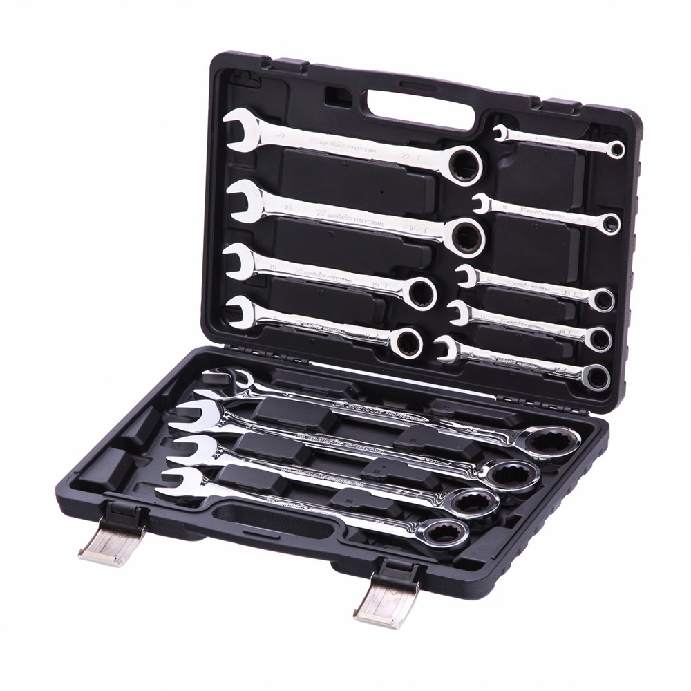 КомплектацияНабор ключей комбинированных, трещоточных - 22 шт, типоразмеры - 6, 7, 8, 9, 10, 11, 12, 13, 14, 15, 16, 17, 18, 19, 20, 21, 22, 23, 24, 27, 30, 32