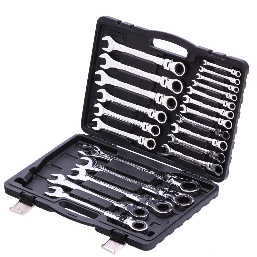 КомплектацияНабор ключей комбинированных, трещоточных шарнирных - 13 шт, типоразмеры - 8, 10, 12, 13, 14, 17, 19, 20, 22, 24, 27, 30, 32