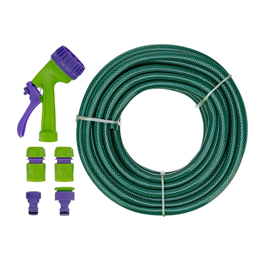 - Прочность и долговечность — шланг изготовлен из высококачественного ПВХ, устойчивого к ультрафиолету, дополнительные элементы набора выполнены из ABS-пластика и не боятся коррозии.