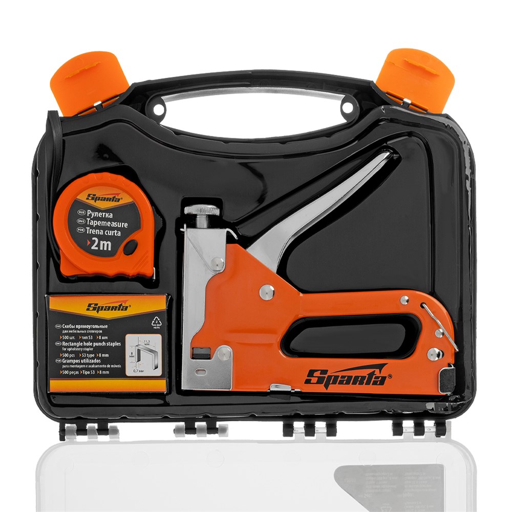 НаименованиеНабор: степлер мебельный регулируемый, скобы 500 шт, рулетка 2 м, тип скобы 53, 4-14 мм Sparta