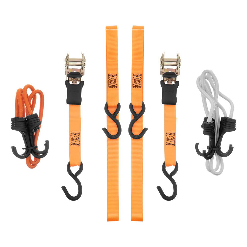 Набор стяжек и резинок Stels 54403 используется для фиксации грузов и будет полезен в автопутешествии. В комплекте ремни с храповыми механизмами, а также резинки разной длины с крюками. Разрывная нагрузка ремней составляет 680 кг, а эластичных стяжек — 50 кг, поэтому они надежно фиксируют предметы различных габаритов, предотвращая их смещение во время перевозки.