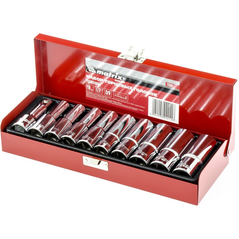 Набор торцевых головок 1/2", головки 10 - 22 мм, удлиненные, 10 предметов Matrix