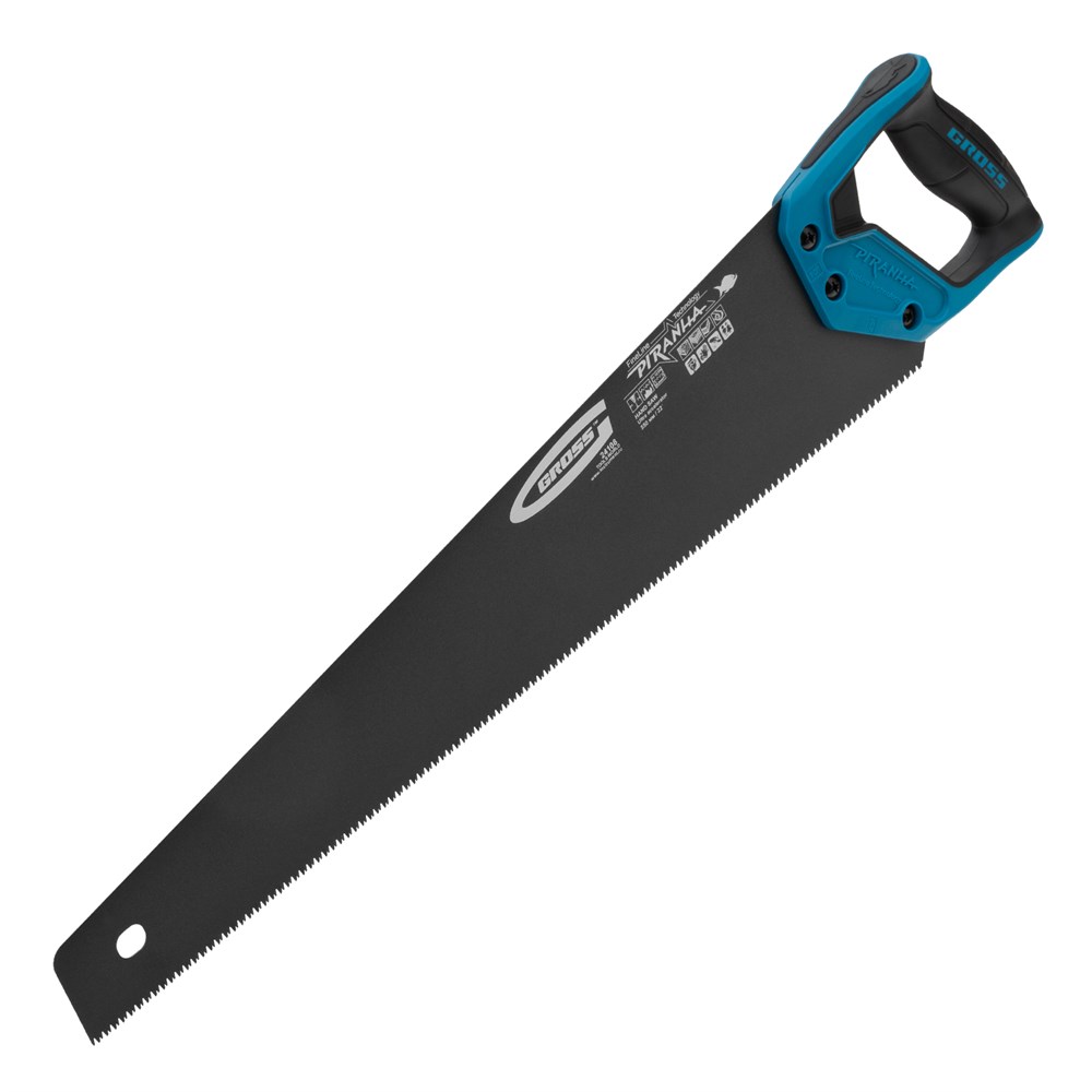 НаименованиеНожовка по дереву "Piranha", 550 мм, 11-12 TPI, зуб-3D, каленый зуб, тефлоновое покрытие полотна, двухкомпонентная рукоятка Gross