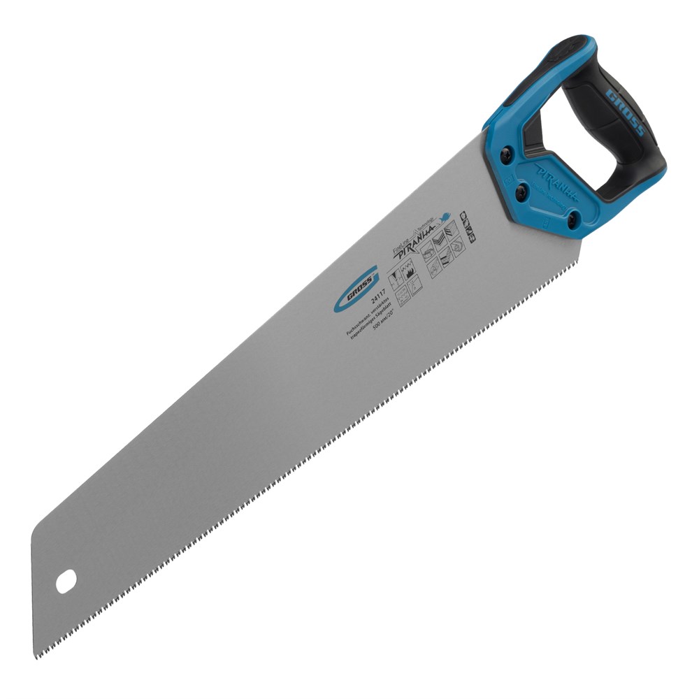 Ножовка по дереву Gross PIRANHA 24117 с усиленным трапециевидным полотном длиной 500 мм, калеными зубьями с 3D-заточкой и шагом 11-12 TPI, с двухкомпонентной рукояткой, используется для выполнения столярных работ. Ей пилят древесину различных пород, МДФ, ДСП, ДВП, ламинат, а также пенополистирол, полиуретан и другие синтетические материалы. Ножовка подходит для продольного и поперечного пиления. Благодаря мелким зубьям с шагом 11-12 TPI выполняет точный и чистый рез. Инструмент рекомендован для профессионального применения, но может использоваться и в быту.