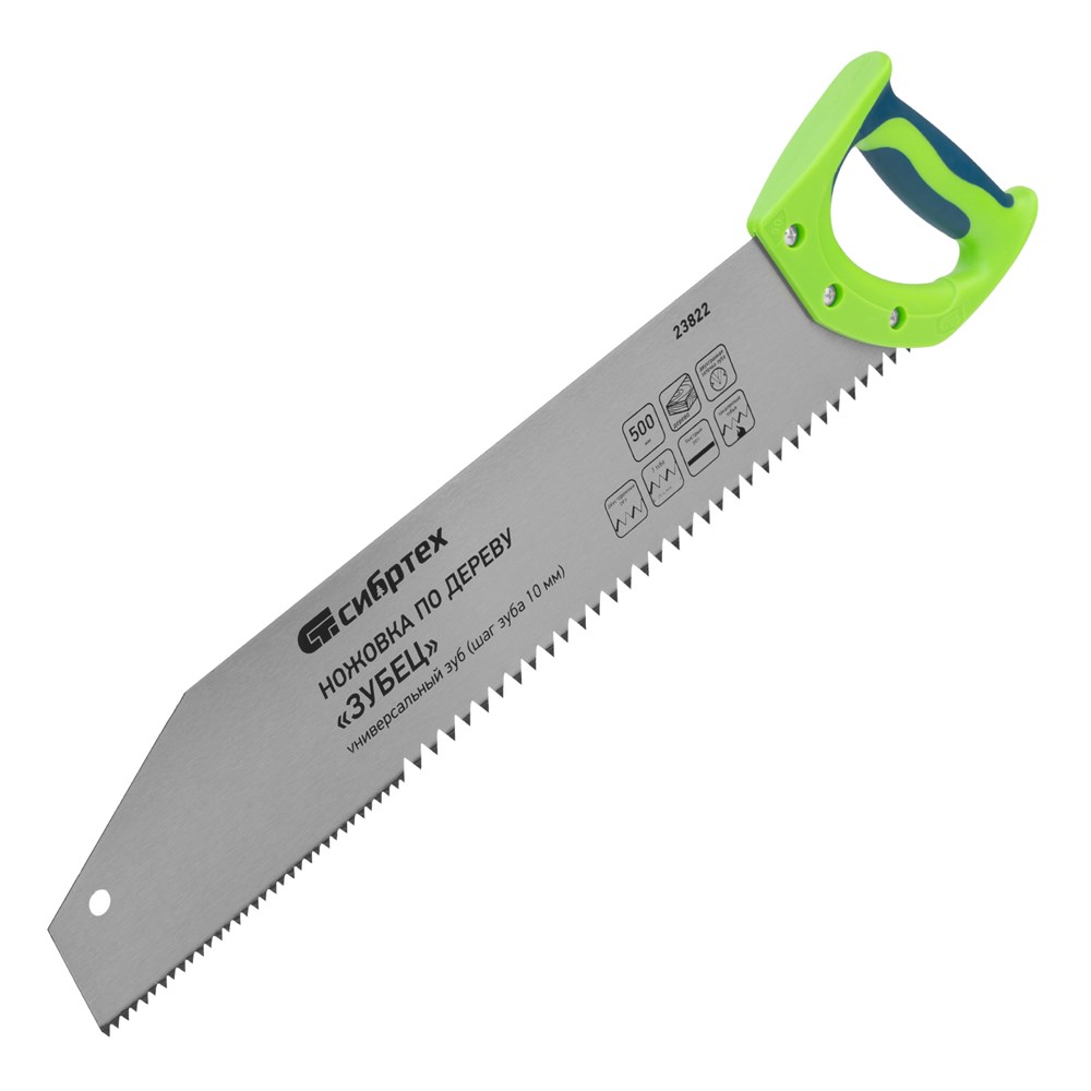 НаименованиеНожовка по дереву "Зубец", 500 мм, шаг зуба 10 мм, каленый зуб 2D, двухкомпонентная рукоятка Сибртех