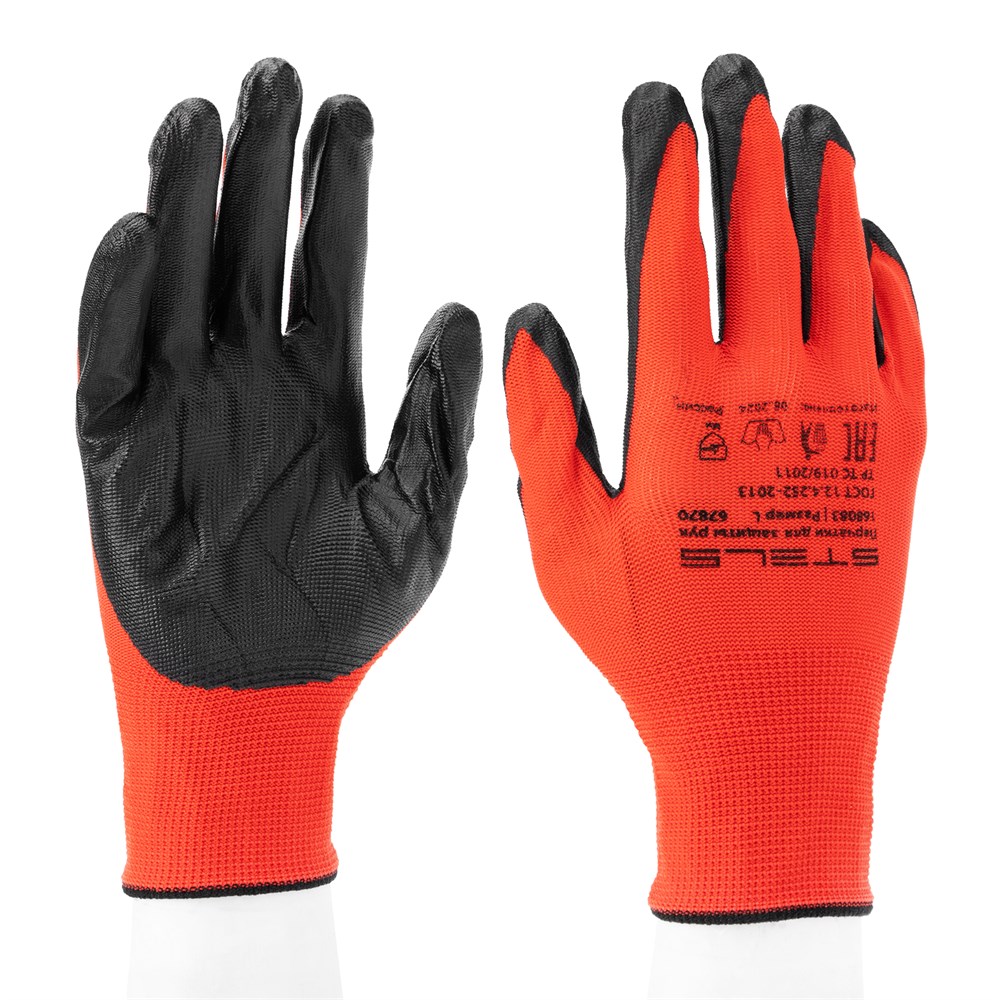 НаименованиеПерчатки полиэфирные с черным нитрильным покрытием маслобензостойкие, L, 15 класс вязки Stels