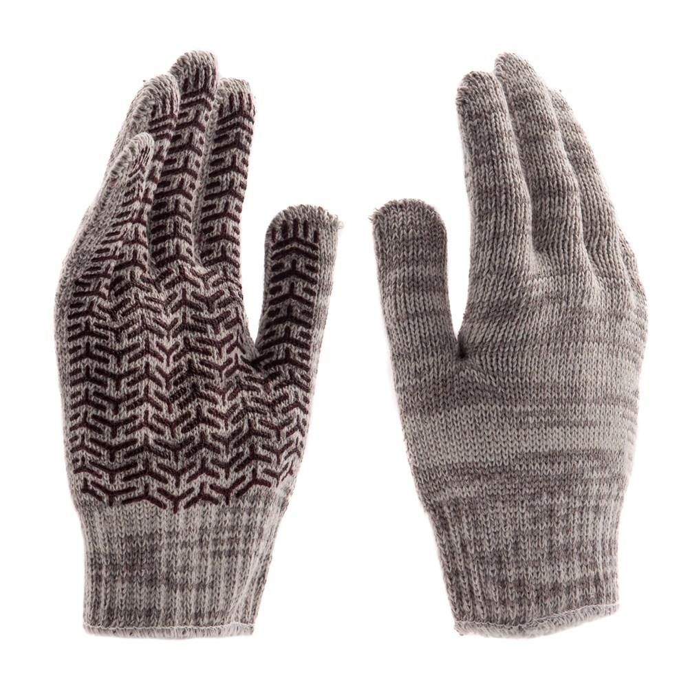 Усиленные трикотажные перчатки Сибртех 68182, бело-серый меланж, с гелевым ПВХ-покрытием, 7 класса вязки, надевают на руки при выполнении тяжелых строительных, монтажных, ремонтных, сборочных и погрузо-разгрузочных работ. Толстая эластичная пряжа надежно защищает кисти рук от травм и попадания грязи, не препятствуя движениям пальцев. Нанесенный на ладонную сторону ПВХ-гель исключает скольжение и способствует надежному захвату инструментов и других предметов.