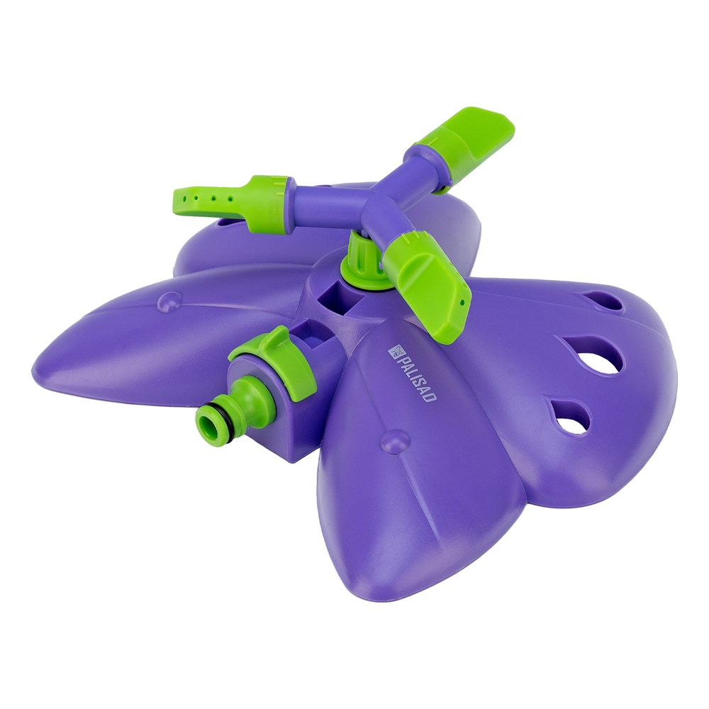 Вращающийся разбрызгиватель Palisad «Бабочка» 65401 с 3 лопастями, с регулировкой, используется для орошения газонов и садовых участков. Максимальная площадь полива составляет 58 кв.м. Дальность распыления можно варьировать от 2 до 4,3 м. На каждой лопасти 4 отверстия, обеспечивающие равномерный полив. Основание выполнено в форме бабочки, что придает устройству оригинальный вид.