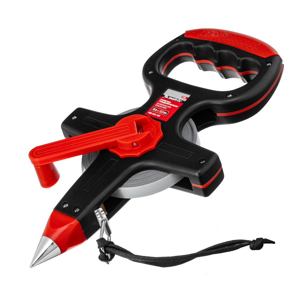 - Удобная эксплуатация — сматывающий механизм с ручкой облегчает возврат измерительного полотна в корпус.