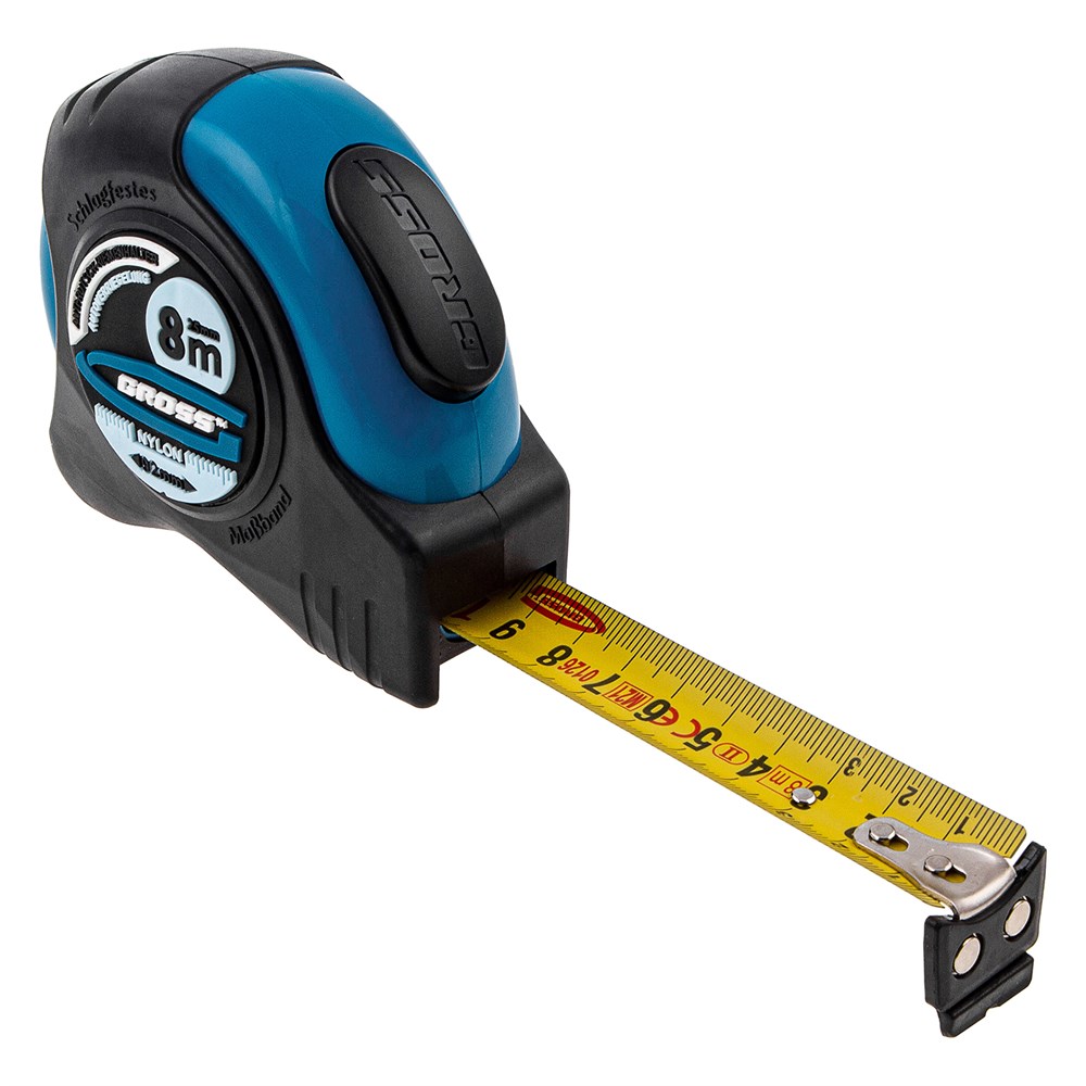 НаименованиеРулетка "Schlagfest",8 м x 25 мм,магнитный обрезиненный зацеп,двусторонняя шкала,Нейлоновое покрытие,автоматическая фиксация Gross