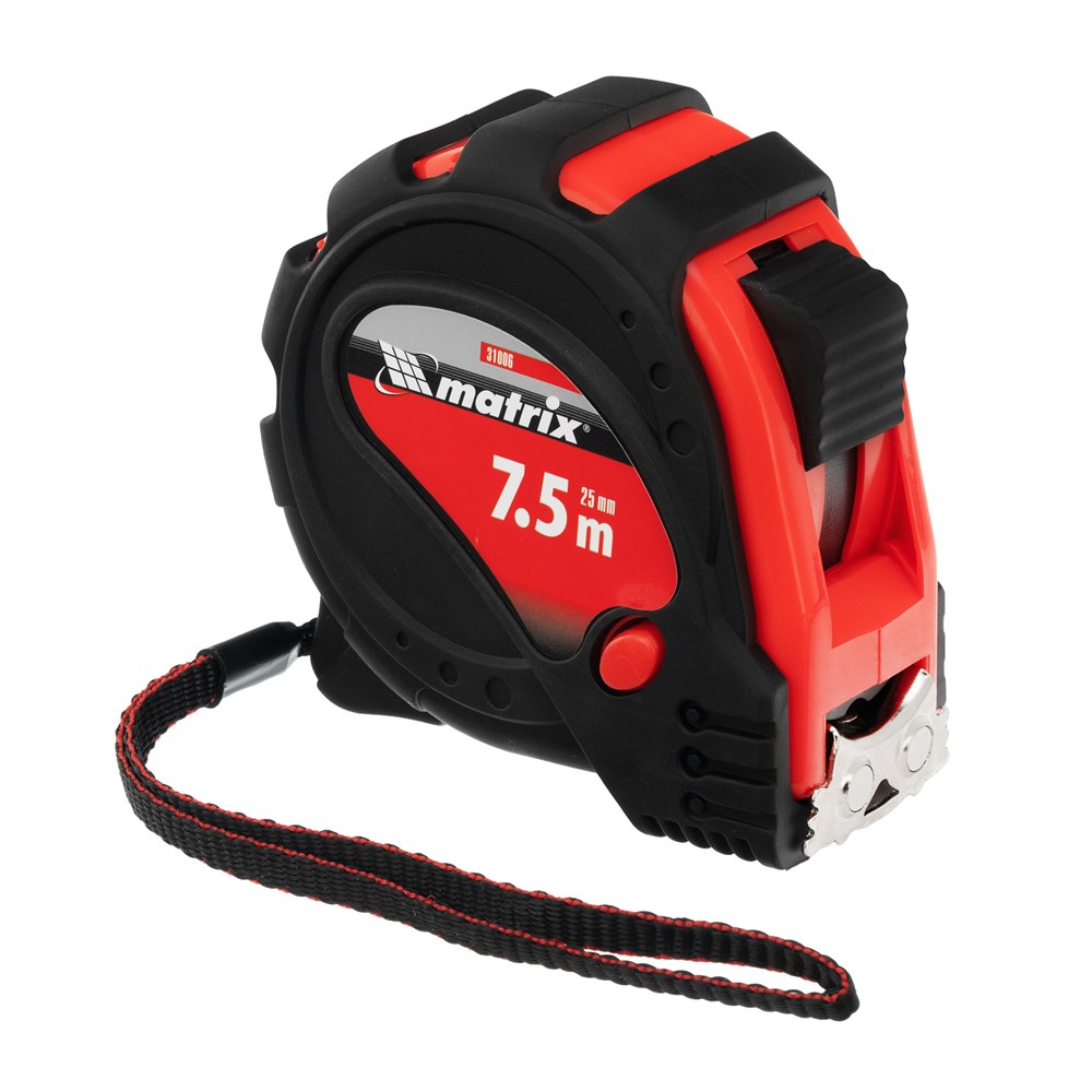 Рулетка Matrix Status magnet 3 fixations 31006 с полотном длиной 7,5 м и шириной 25 мм, в обрезиненном корпусе, оснащенная зацепом с магнитом, предназначена для измерения различных объектов и расстояний. Имеет класс точности 2 и цену деления 1 мм, что обеспечивает достаточную результативность замеров. Магнитный зацеп позволяет четко фиксировать измерительное полотно на металлических предметах. Стальная лента шириной 25 мм обладает большой упругостью, что облегчает работу в труднодоступных местах. Рулетка будет полезна при проведении строительных работ, а также пригодится в быту.
