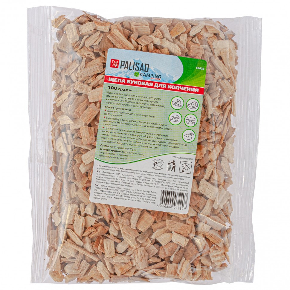 Буковая щепа для копчения Palisad Camping 69622, 100 г в упаковке, используется для горячего или холодного копчения мяса, рыбы, птицы, овощей, сыров. Удобная фасовка по 100 г позволяет использовать всю упаковку за один раз. Щепа пригодится на даче или пикнике.