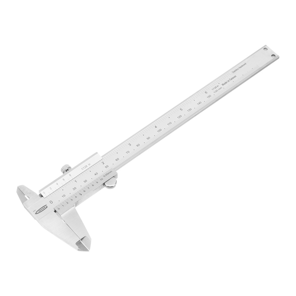 Штангенциркуль Gross 31671 из нержавеющей стали, с глубиномером, предназначен для измерения внутренних и наружных размеров деталей и заготовок в диапазоне 0-150 мм. Значение отсчета по нониусу составляет 0,05 мм. Погрешность находится в пределах ±0,02 мм при измерении до 100 мм, и ±0,03 мм — свыше 100 мм. Инструмент имеет губки двух видов для облегчения замеров внутри и снаружи предметов. Штангенциркуль будет полезен на производственном предприятии, в слесарной и столярной мастерской, автосервисе, а также пригодится в быту.