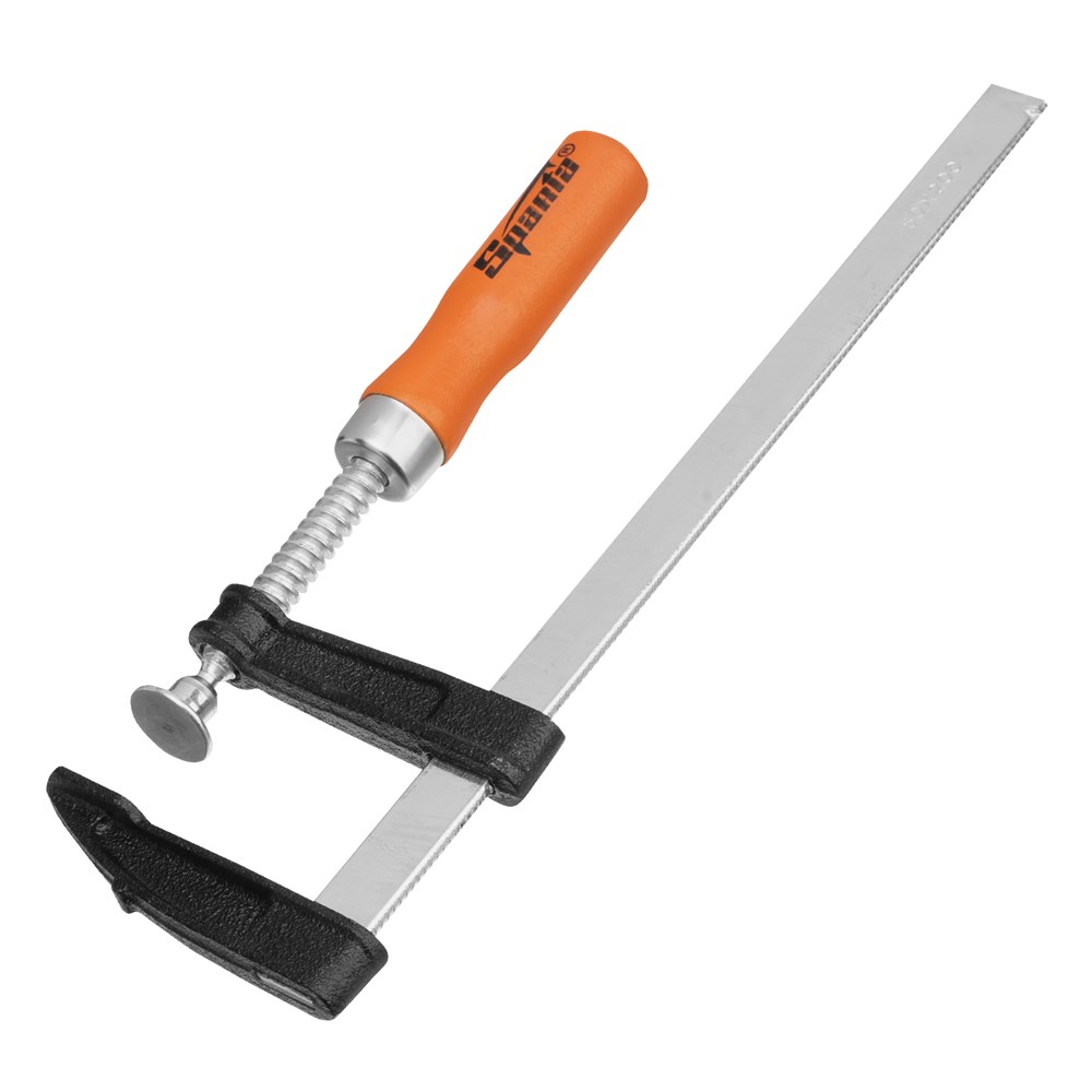 F-образная струбцина Sparta 204265 длиной 250 мм и величиной зажима 200 х 50 мм позволяет фиксировать заготовки из металла, древесины и других материалов для их соединения или обработки. Используется в столярном и слесарном деле. Деталь помещают между губками, одна из которых подвижна и служит для регулировки величины захвата. Винтовой зажим позволяет фиксировать заготовку со значительным усилием. Элементы конструкции выдерживают высокую температуру, поэтому струбцина подходит для проведения сварочных работ, при этом пластиковые накладки необходимо снять.