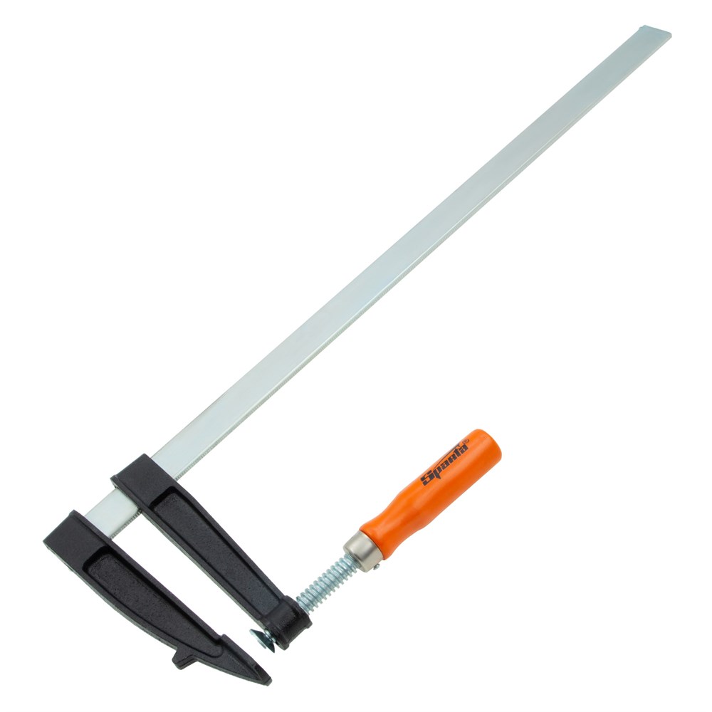 F-образная струбцина Sparta 204415, 500 х 120 х 570 мм, используется в столярном и слесарном деле и позволяет фиксировать заготовки из металла, древесины и других материалов для их соединения или обработки. Деталь помещают между губками, одна из которых подвижна и служит для регулировки величины захвата. Винтовой зажим позволяет прикладывать значительное усилие для надежной фиксации. Защитные накладки предотвращают повреждение детали. Элементы конструкции выдерживают высокую температуру, поэтому струбцина подходит для проведения сварочных работ, при этом пластиковые накладки необходимо снять.