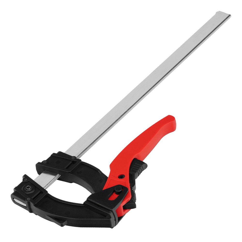 Реечная быстрозажимная струбцина Matrix 20738, 300 х 90 х 390 мм, штанга 5 х 20 мм, с пластиковым корпусом и рычажным храповым механизмом, используется для зажимания и удержания заготовок с целью их скрепления или последующей обработки. Рычажно-храповый механизм позволяет надежно зафиксировать деталь, пошагово перемещая подвижную губку вдоль штанги. Струбцина пригодится при выполнении столярных работ в мастерской, дома или на даче.