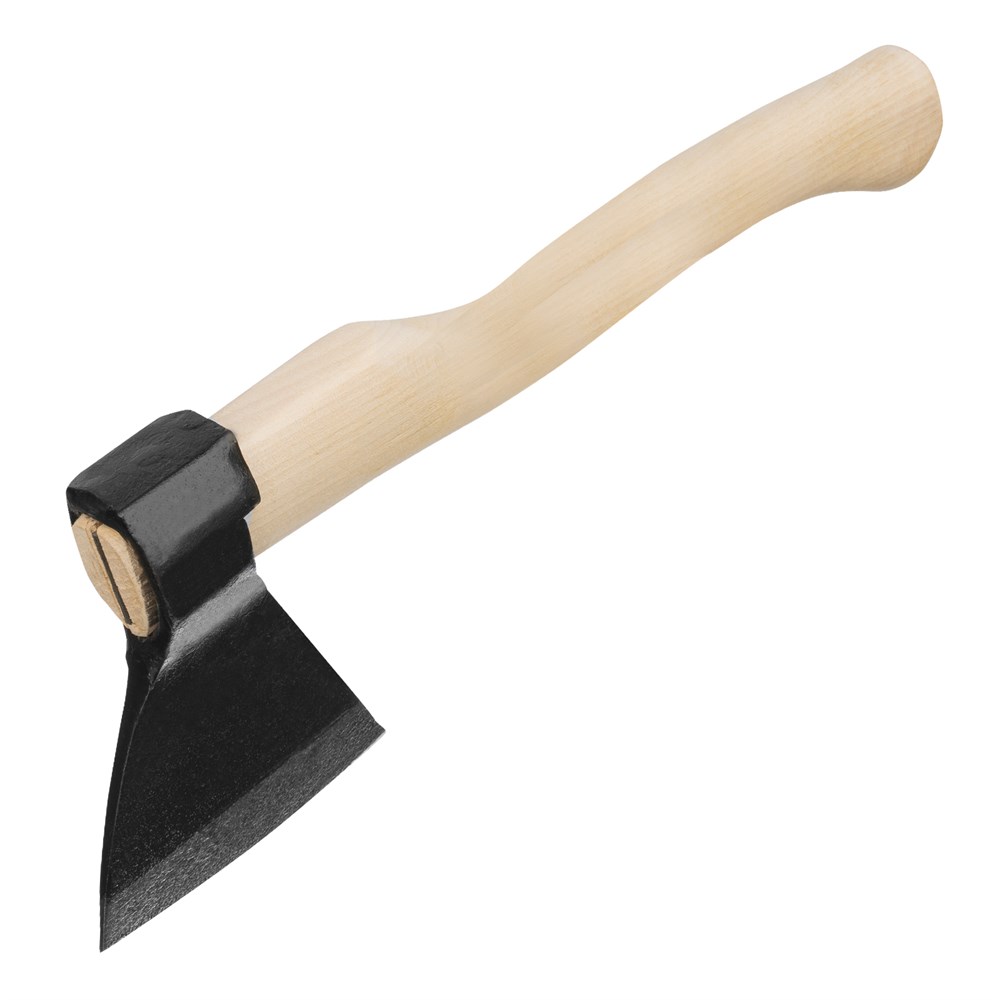 Кованый топор Б 21672 с рабочей частью весом 840 г и деревянным топорищем длиной 400 мм, весит в сборе 1070 г и рассчитан на бытовое использование. Инструмент с небольшим прямым лезвием позволяет рубить и тесать древесину любых пород.