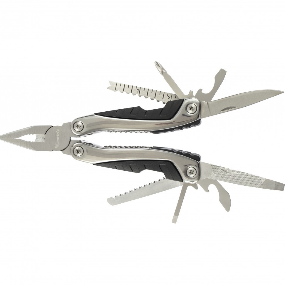 Трансформер Matrix 17623 длиной 160 мм имеет 15 функций и авторазжим, поставляется с чехлом. Может использоваться в гараже, т.к. включает длинногубцы с кусачками и захватом полукруглых предметов, а также отвертки и линейку. Трансформер пригодится в походе, на рыбалке или охоте, поскольку имеет в составе нож, пилу, открывалку, консервный нож, инструменты для чистки рыбы и удаления крючка. Благодаря пилке для ногтей мультитул будет полезен в быту.