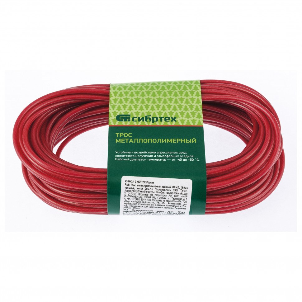 НаименованиеТрос металлополимерный красный ПР-4.0, толщина 4.0 мм, моток 20 метров Сибртех