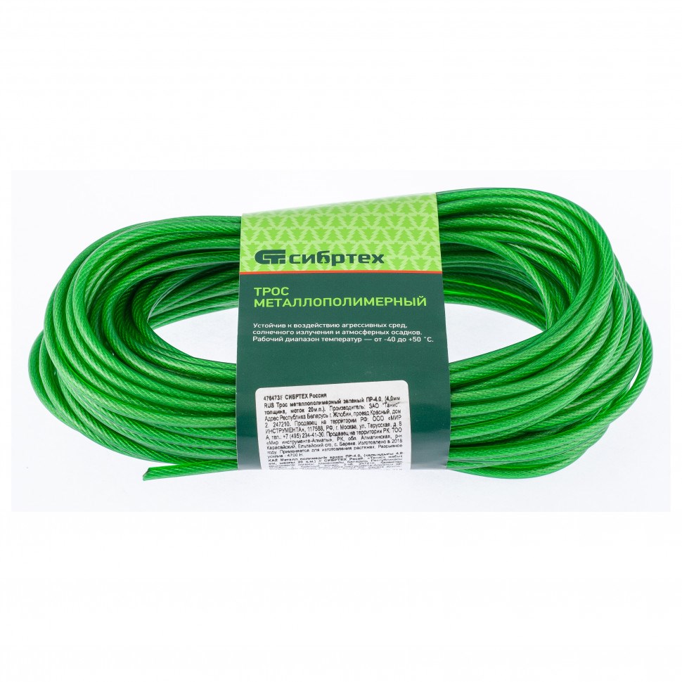 Трос металлополимерный зеленый ПР-4.0, толщина 4.0 мм, моток 20 метров Сибртех