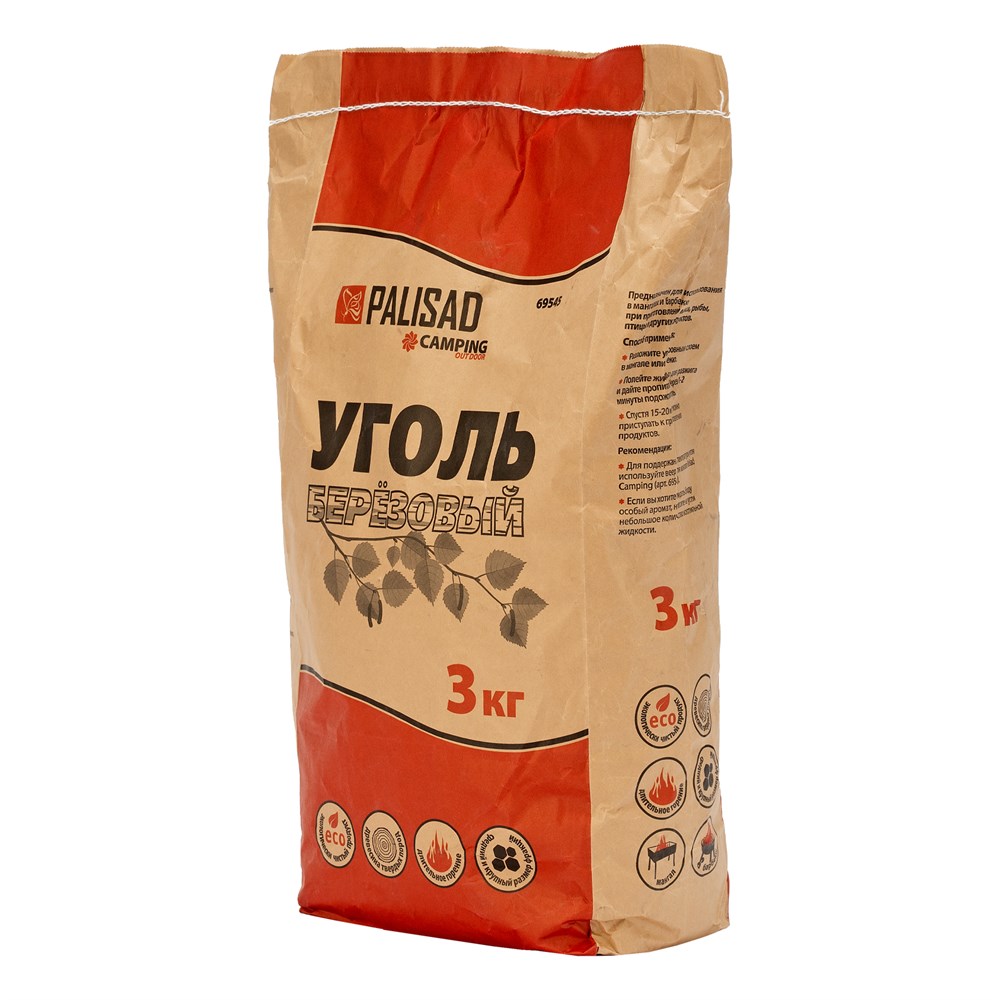 Березовый уголь Palisad Camping 69545, объем упаковки 3 кг, используется в качестве топлива для приготовления пищи на открытом воздухе: с помощью мангала, гриля или барбекю. Пакета хватит для небольшой компании на даче или пикнике.