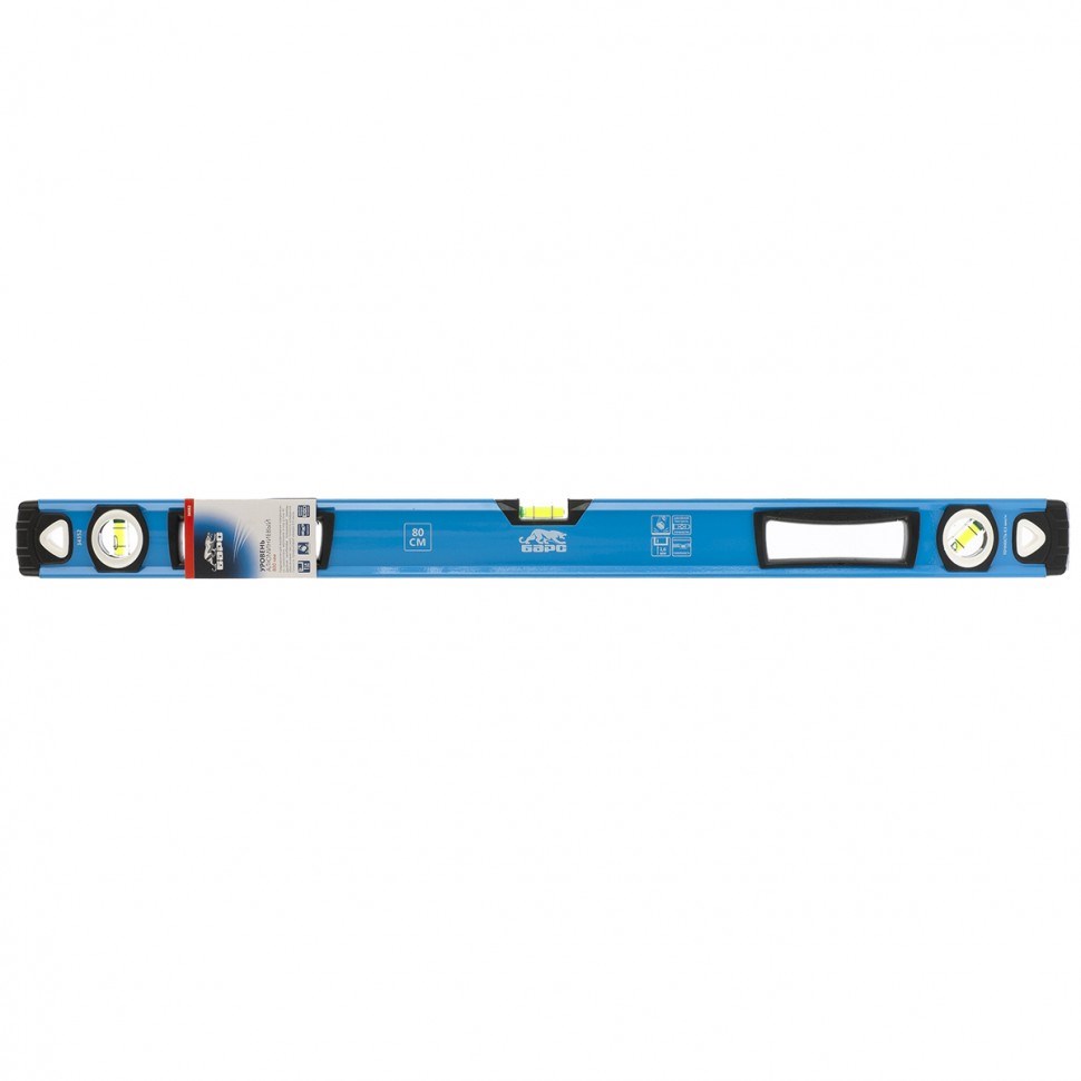НаименованиеУровень алюминиевый, двуручный, 800 мм, профиль 1,6 мм, фрезеров, ударопрочные заглушки, 3 глазка Барс