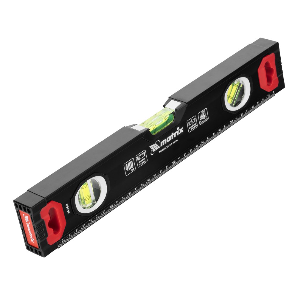 Уровень алюминиевый усиленный Matrix 34360 длиной 400 мм, фрезерованный, с 3 глазками, используется для проверки точности горизонтальных и вертикальных поверхностей и угла 45°. Инструмент повышает качество монтажных, отделочных и других работ, незаменим на строительной площадке.